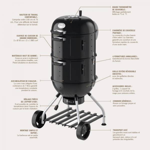 Equipé de plusieurs grilles de 50cm de diamètre et de crochets pour disposer vos aliments, ce fumoir en acier émaillé est parfaitement mobile grâce à ses 2 roues et son chariot particulièrement robuste. Son couvercle à charnière rend son utilisation très pratique. La hauteur de travail entre 73cm et 1m le rend aussi très ergonomique.