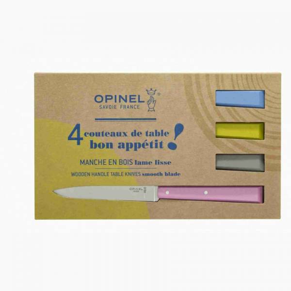 Le coffret de 4 couteaux contient le N°125 azur, le N°125 tilleul, le N°125 gris, le N°125 rose.